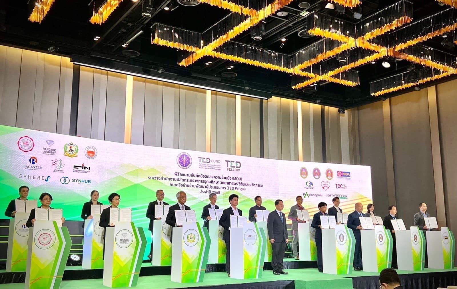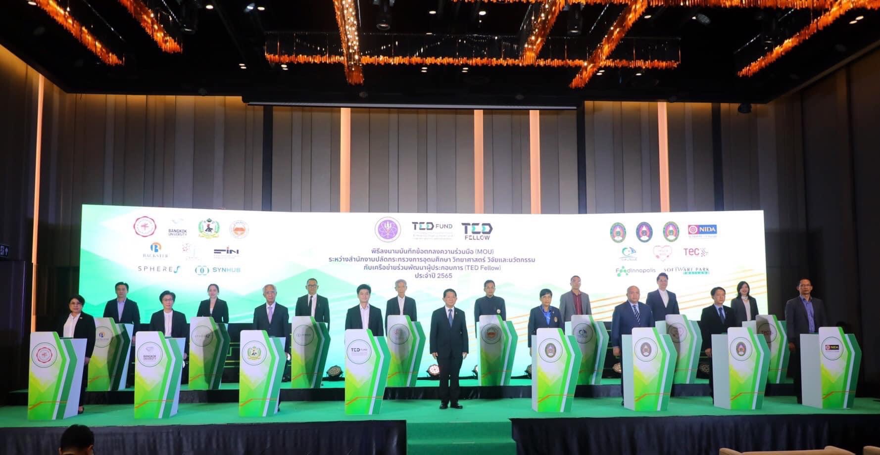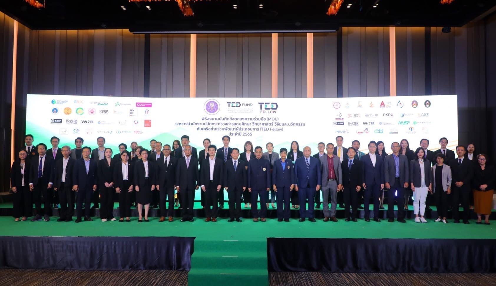 ทาง กองทุนพัฒนาผู้ประกอบการเทคโนโลยีและนวัตกรรม (TED Fund เทดฟัน) กระทรวงการอุดมศึกษา วิทยาศาสตร์ วิจัยและนวัตกรรม (อว.) จัดพิธีลงนามบันทึกข้อตกลงความร่วมมือ (MOU) ระหว่างสำนักงานปลัดกระทรวงการอุดมศึกษา วิทยาศาสตร์ วิจัยและนวัตกรรม กับเครือข่ายร่วมพัฒนาผู้ประกอบการ (TED Fellow) “เทดฟอลโลว์” จำนวน 18 หน่วยงานทั่วประเทศ เพื่อหวังบ่มเพาะ พร้อมให้คำปรึกษาแก่ผู้ประกอบการที่ต้องการเงินทุนวิจัย และพัฒนาต่อยอดสู่เชิงพาณิชย์